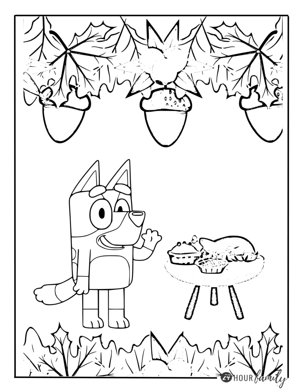 This coloring page showcases the essence of Thanksgiving—family. Featuring Bluey’s whole family, from her parents to her friends, this illustration prompts children to think about their own familial bonds. As they color, they can share stories about their family traditions and what Thanksgiving means to them. What’s more, it provides them with a moment to slow down and reflect on gratitude while engaging in artistic flair.