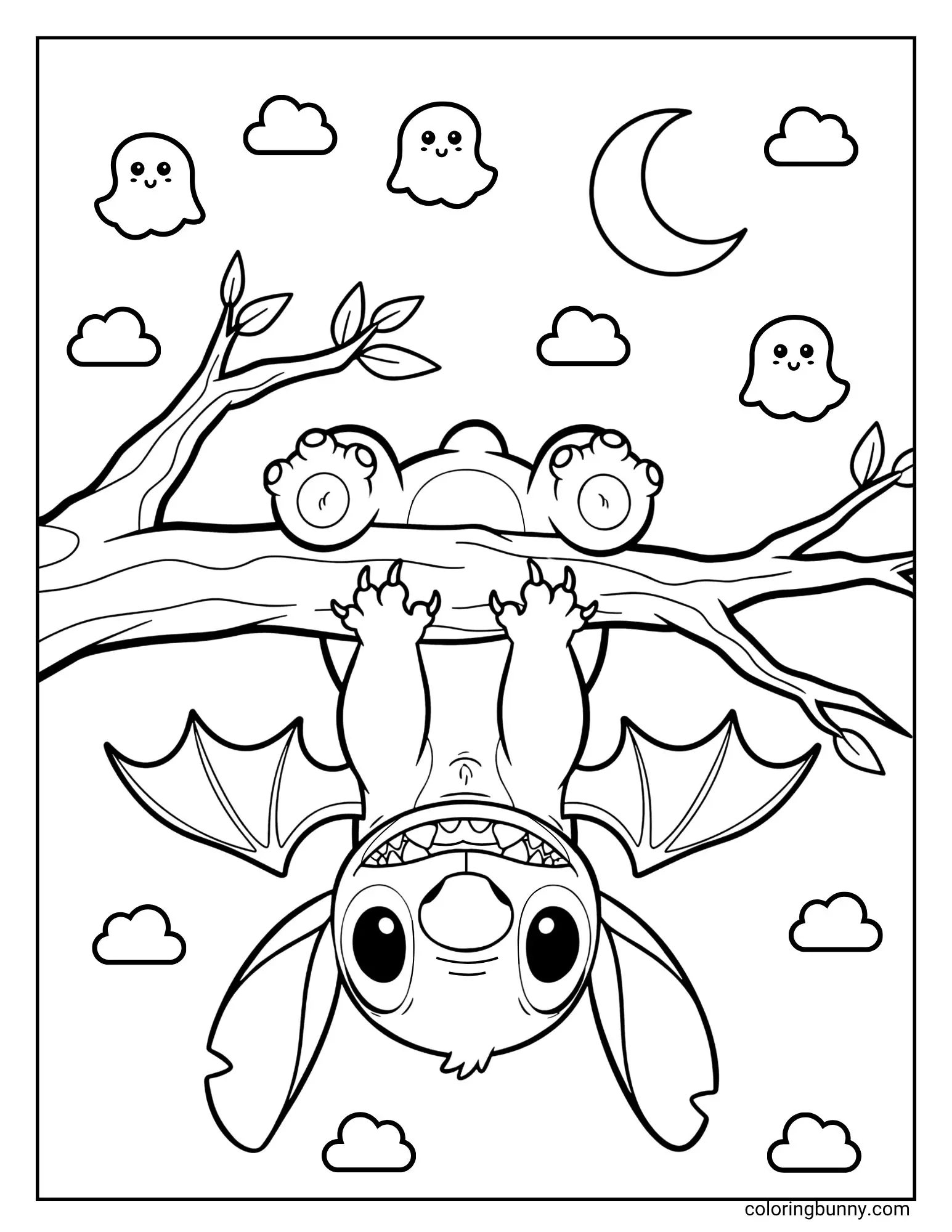 Stitch with bat wings having upside down on a branch coloring page.jpg